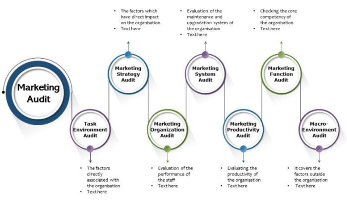 Several marketing elements, including task environment audits, environmental audits, marketing strategy audits, marketing organization audits, marketing audits, and many more, are listed in an online source. It determines your overall performance or the implementation of marketing effort criteria over the years, which differ depending on the industry or firm.